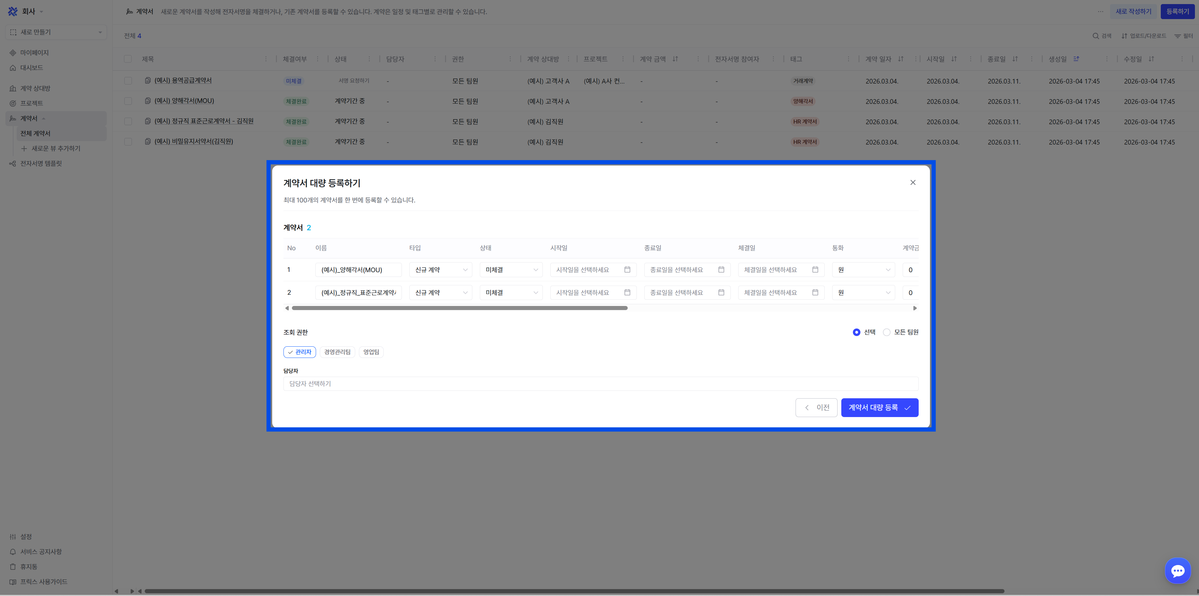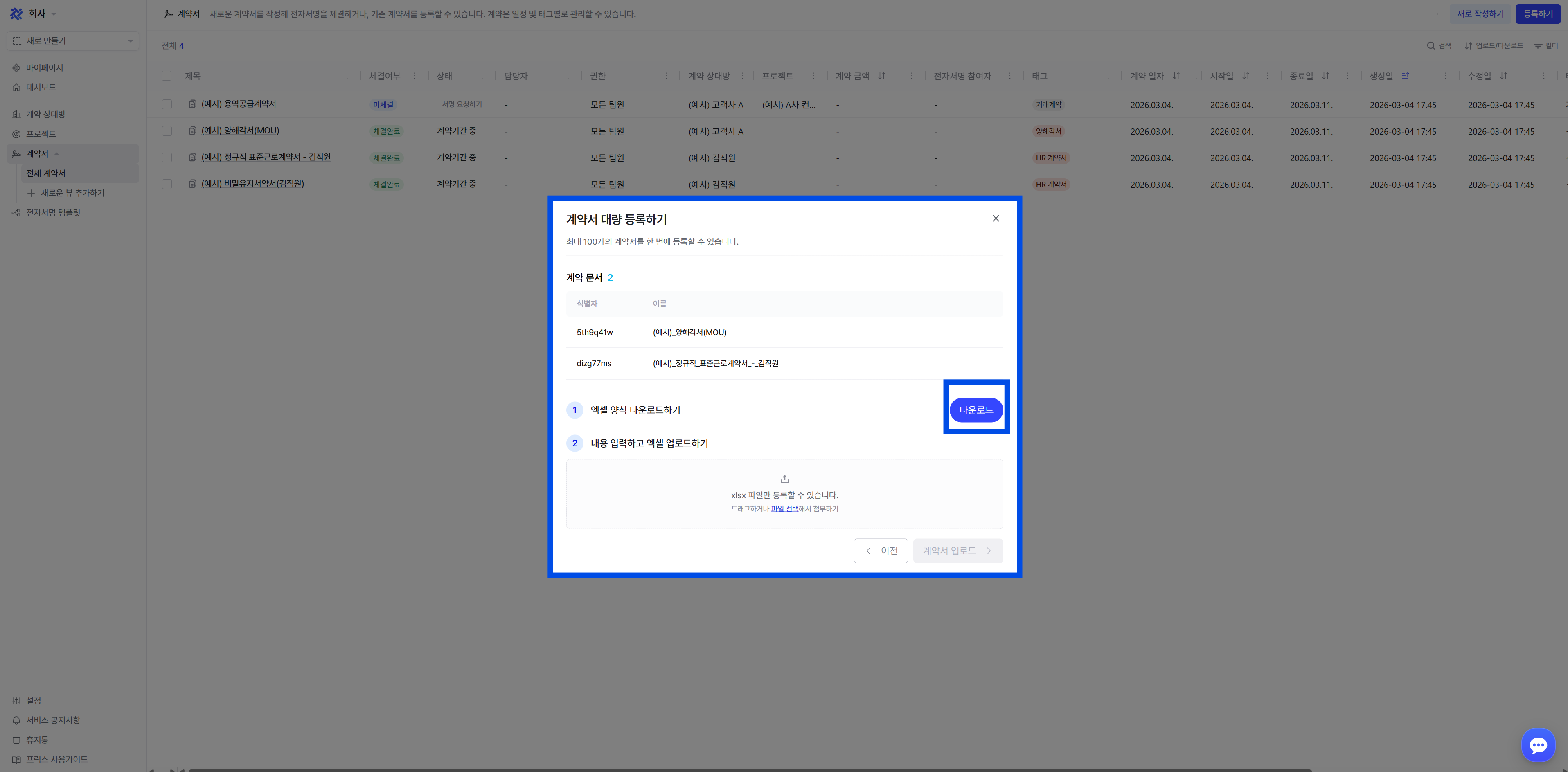 '대량 등록하기': 계약서를 한번에 100개까지 업로드할 수 있음